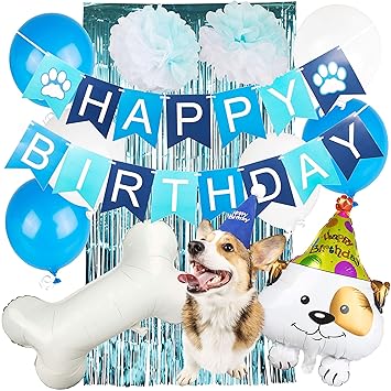 Amazon Com Pupteck Dog Birthday Party Supplies Dog Birthday Bandana Pet Birthday Hat Accessories Dog Face Banner Dog Paw Print Woof Balloons With Pump Cake Topper Decorations Kitchen Dining